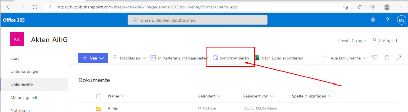 Über die unten genannten Links die jeweiligen Bibliothek aufrufen. Anschließend auf -Synchronisieren- klicken und ggf. die Meldung bestätigen (siehe Screenshots). Danach wird das Laufwerk im Explorer angezeigt.